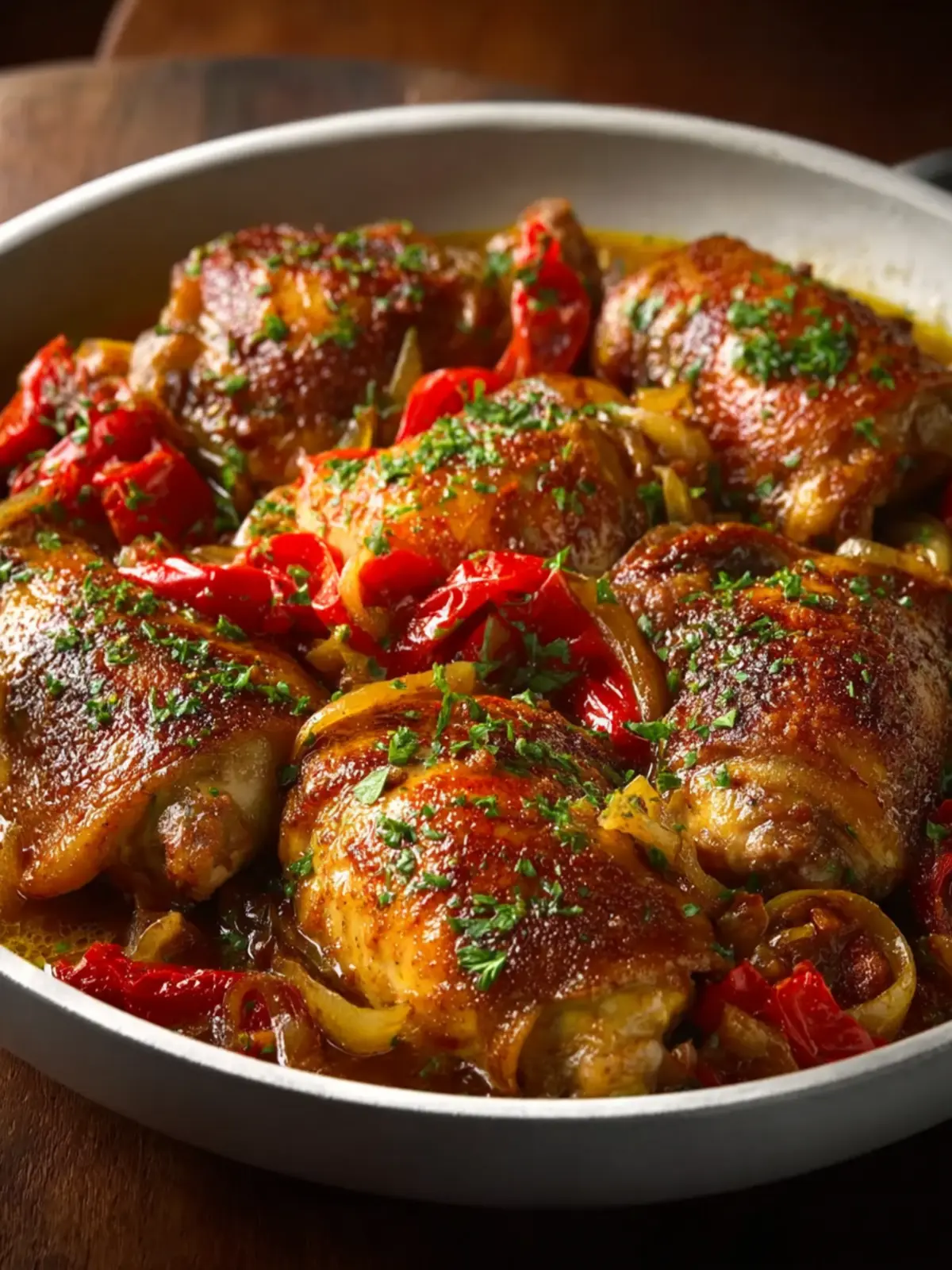 A hearty dish featuring seared chicken thighs, beef sausage, and an array of sautéed peppers, simmered to perfection.
