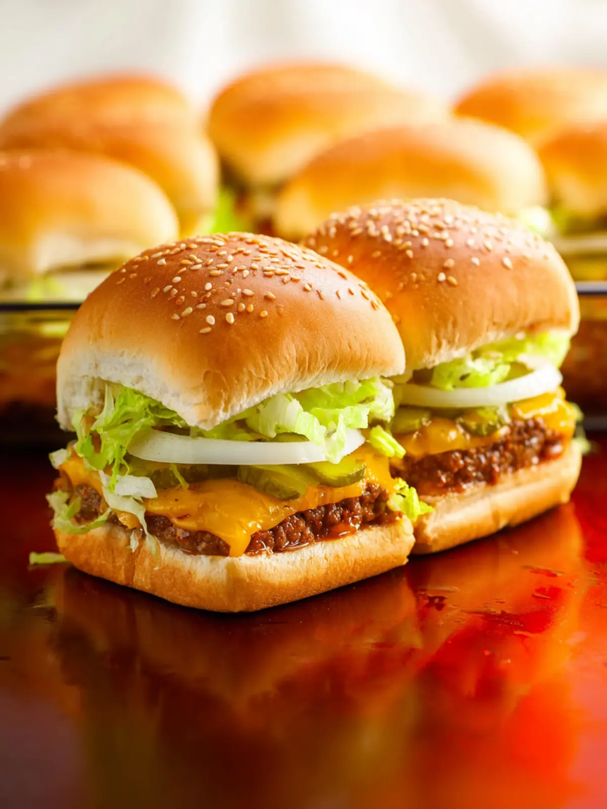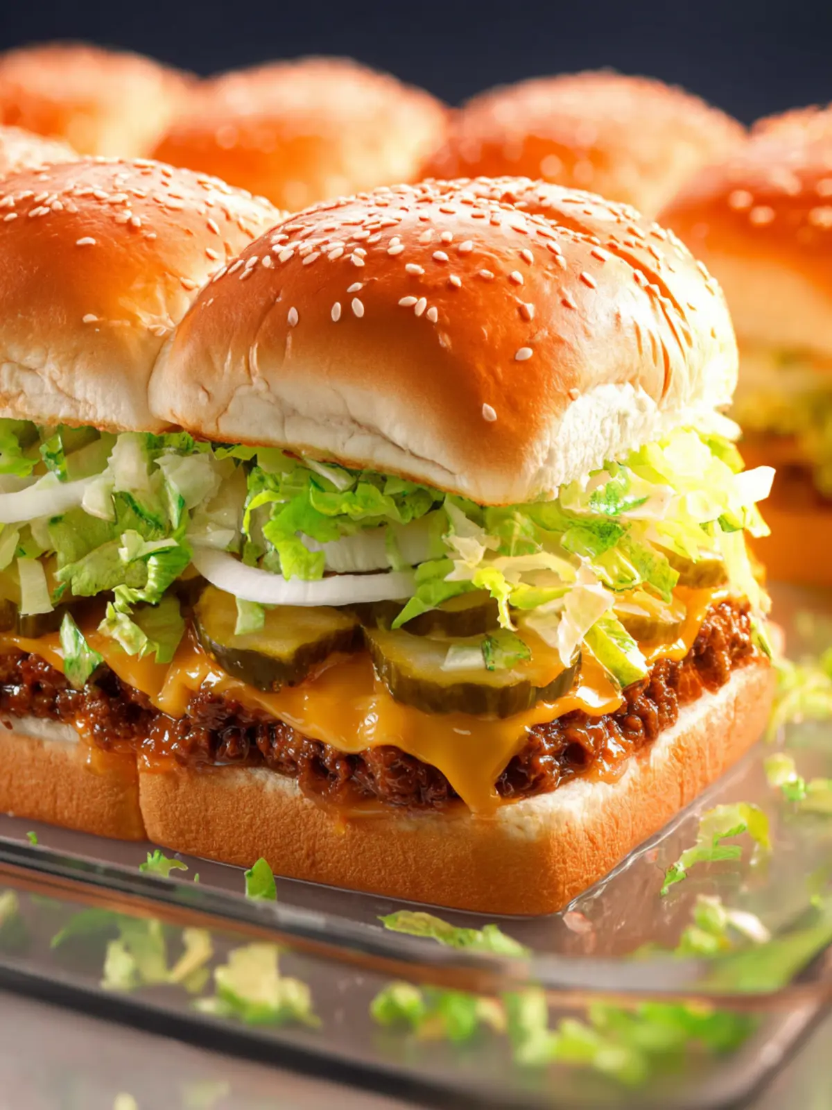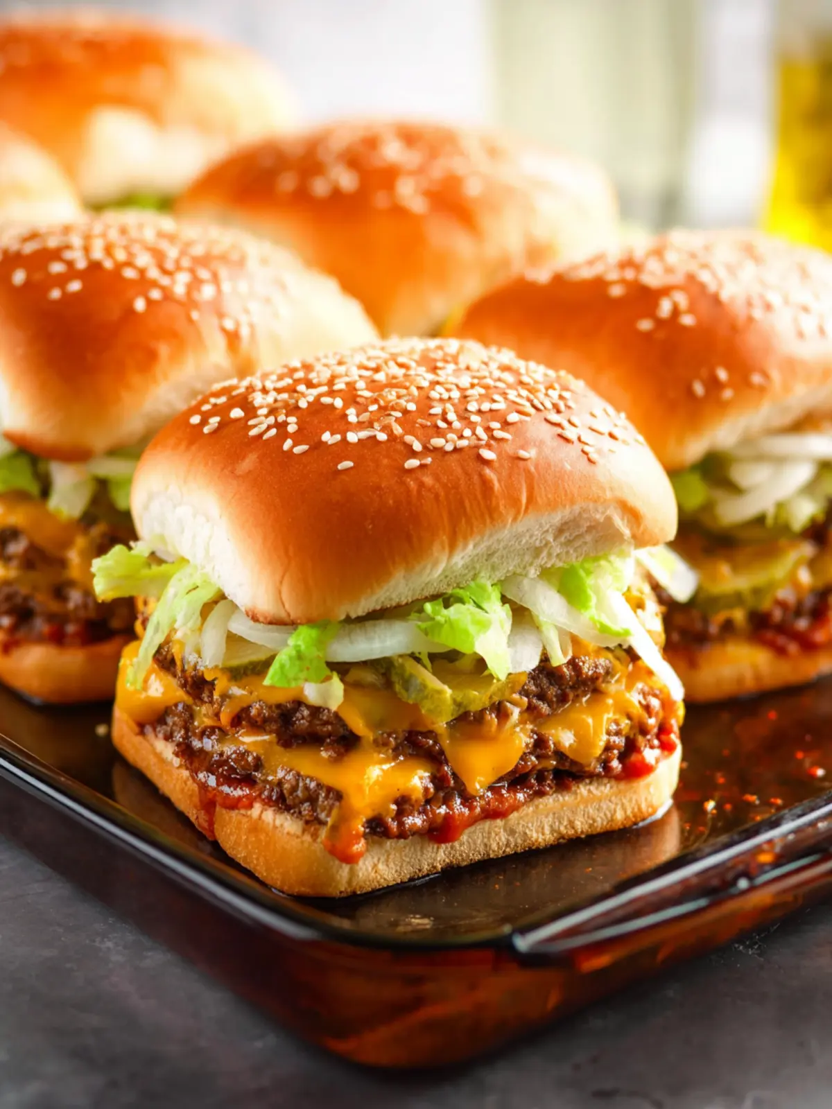 Delicious mini sliders reminiscent of the iconic Big Mac, complete with a special sauce and classic toppings.