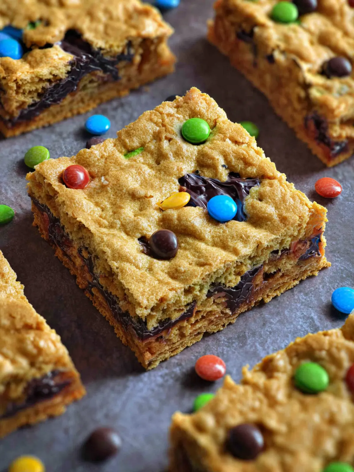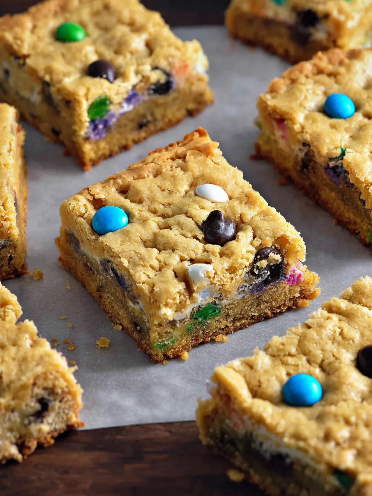 Deliciously soft and chewy peanut butter bars filled with chocolate chips and M&Ms.