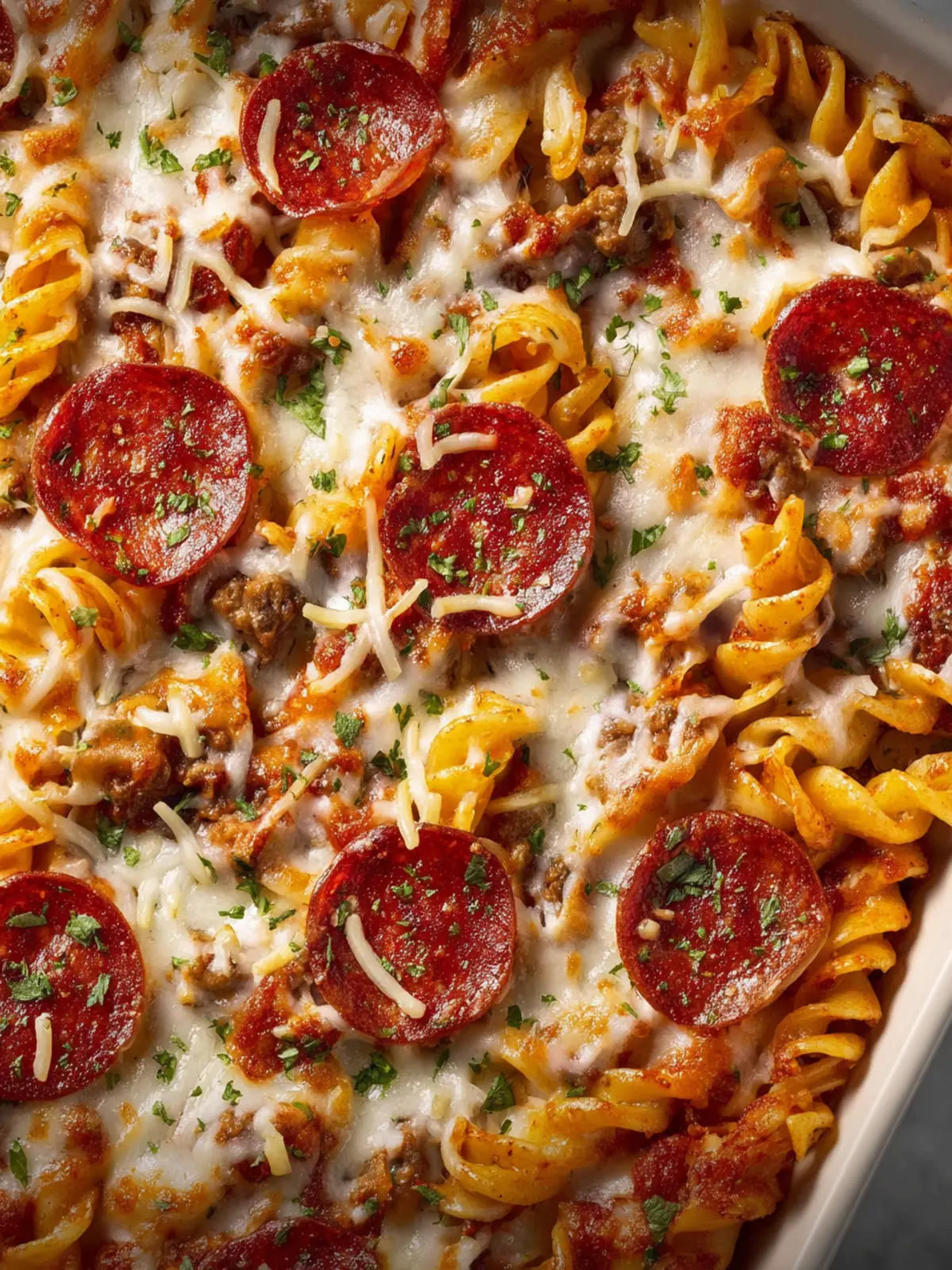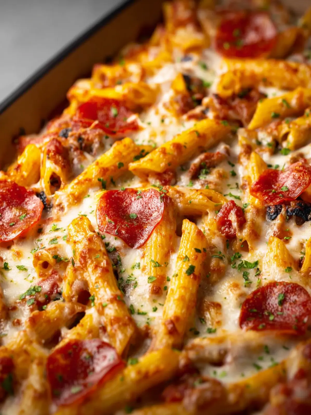 A delicious baked pasta dish featuring Italian sausage, pepperoni, and cheese.
