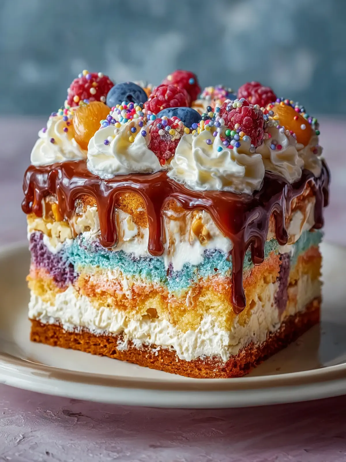 6. Spread the whipped topping over the final layer and drizzle with caramel or berry sauce.