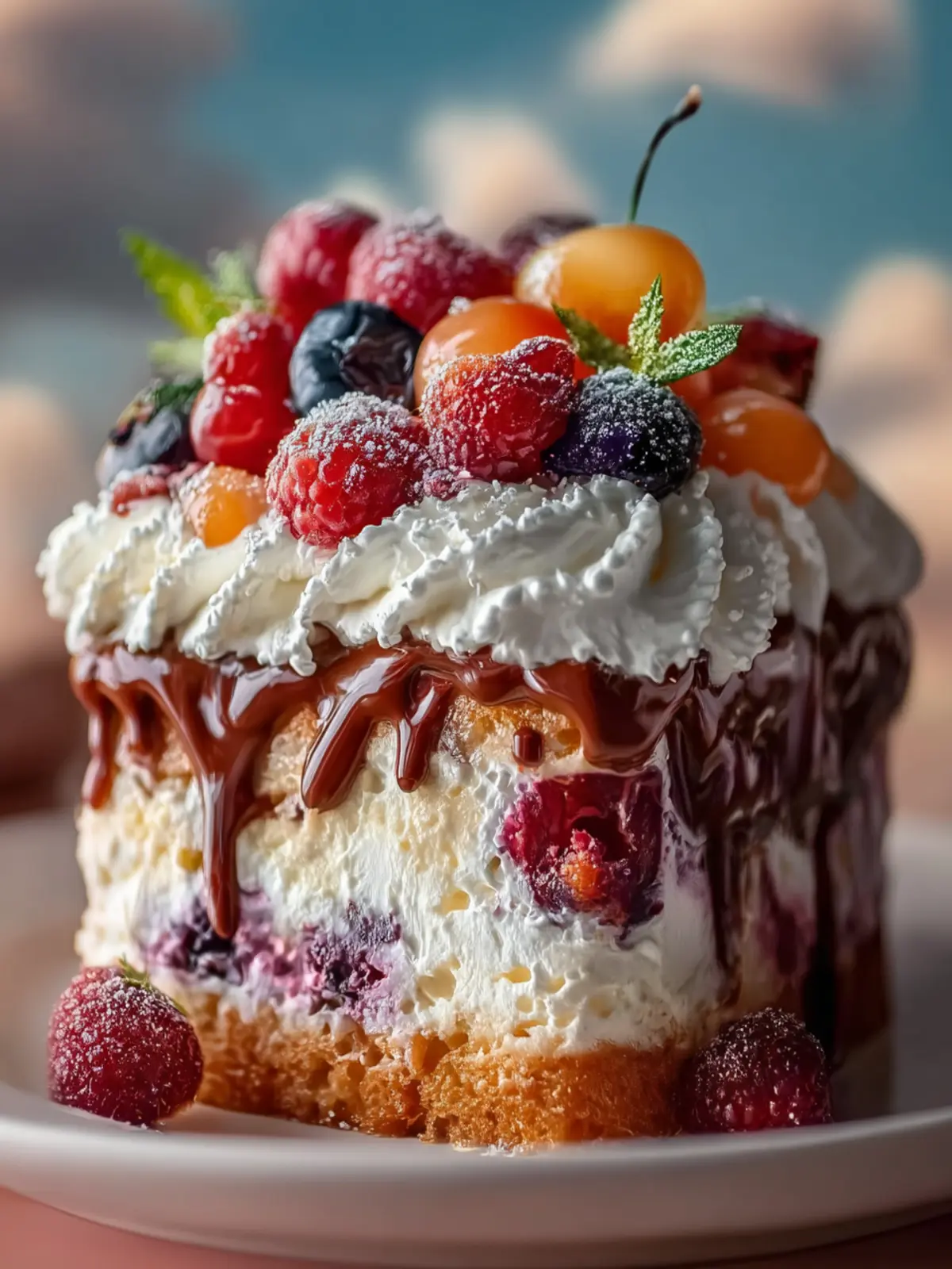 Garnishes: Fresh berries and swirls of whipped cream on top don’t just taste good—they make your Heaven on Earth Cake even more enticing and beautiful.