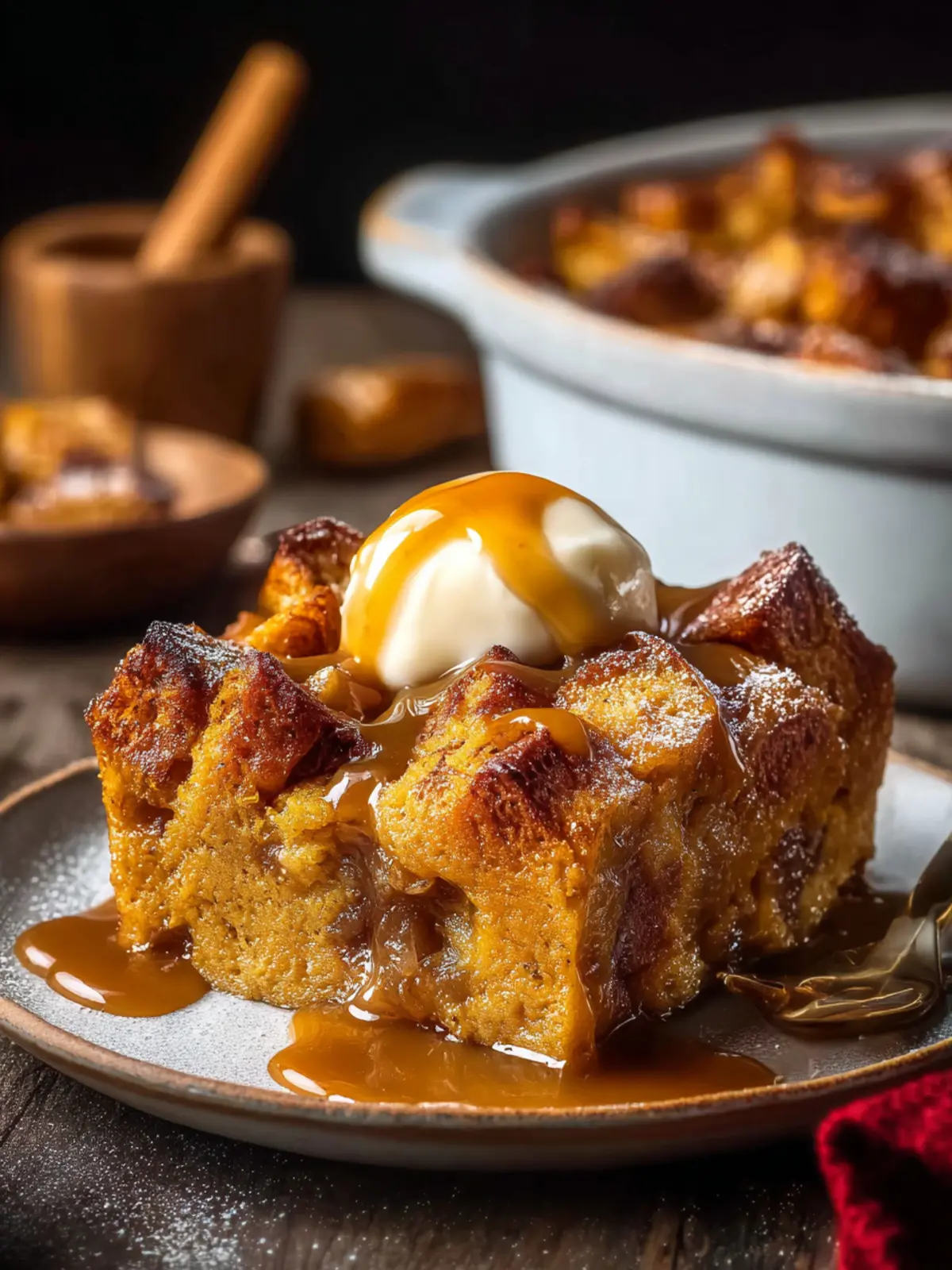 • Vanilla ice cream: Creamy and contrasting against the warm bread pudding.
