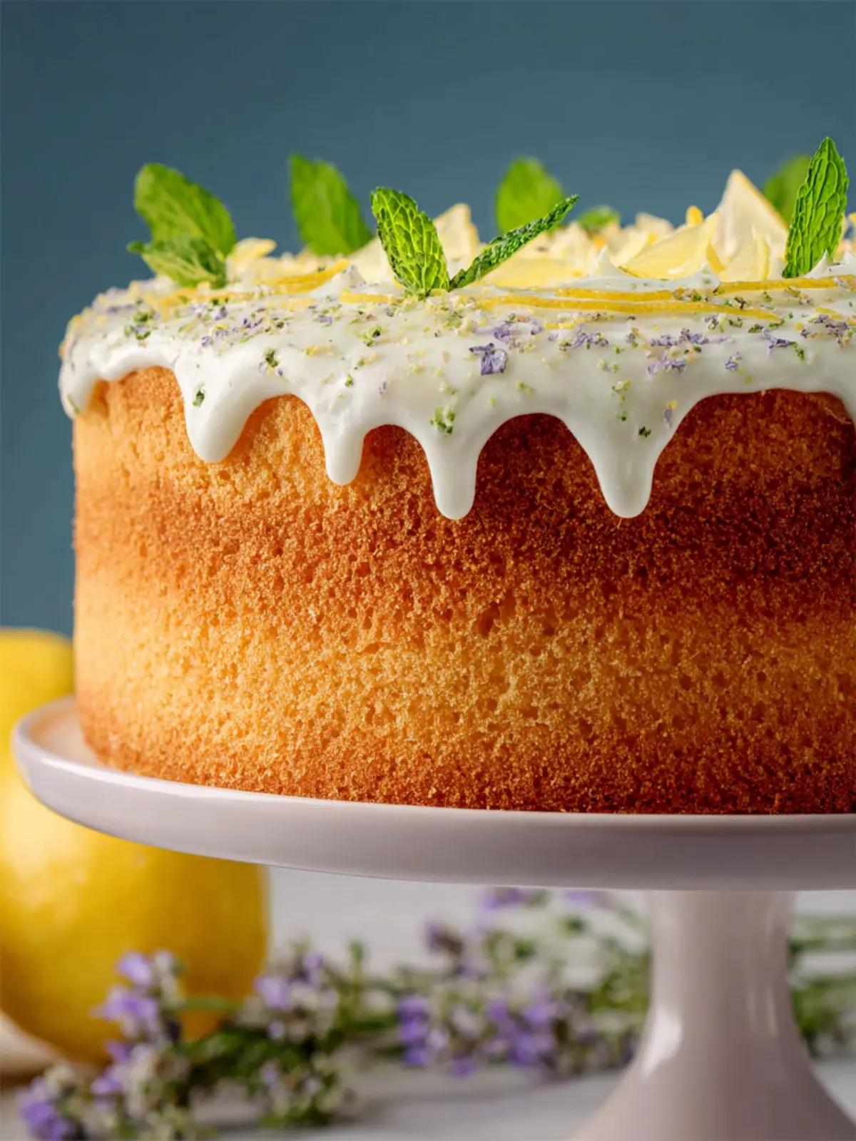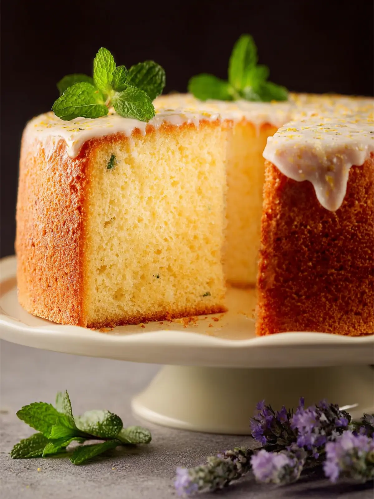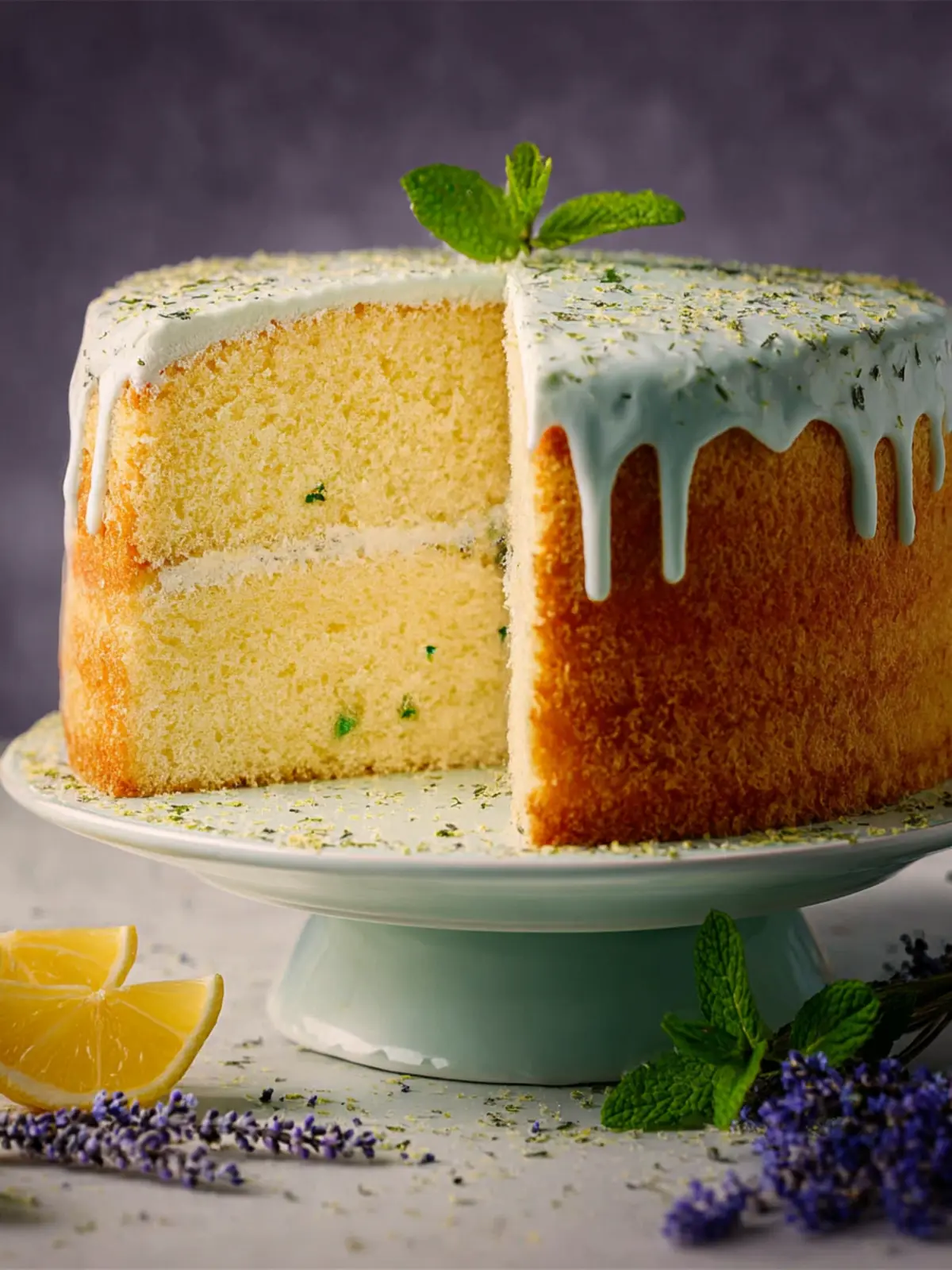 A delightful lemon cake infused with fresh mint and a touch of lavender, perfect for any occasion.