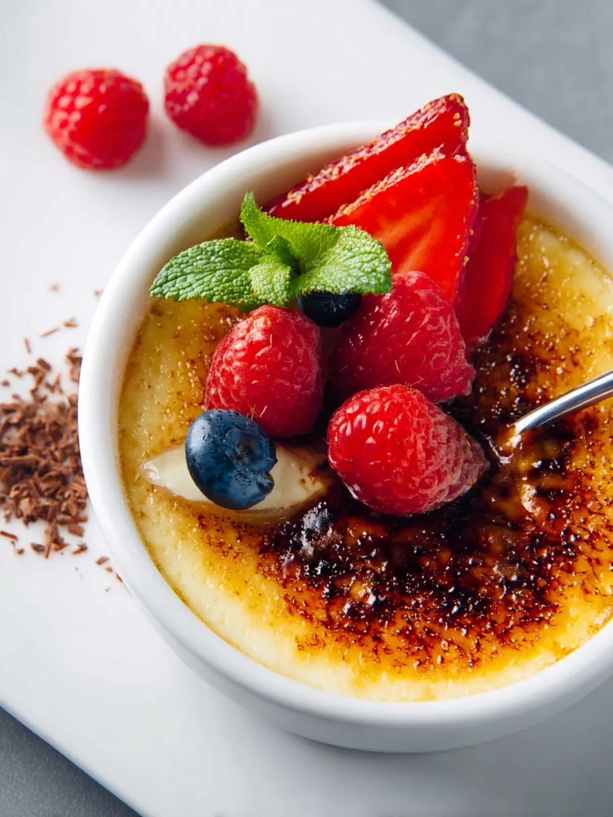 A rich and creamy chocolate dessert topped with a caramelized sugar crust and served with fresh berries.