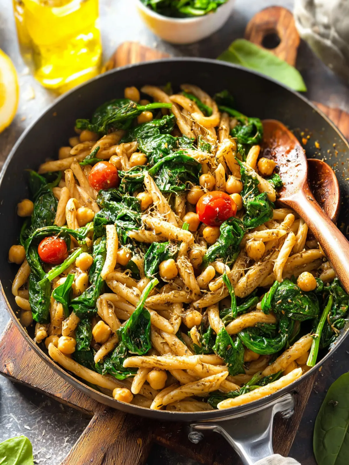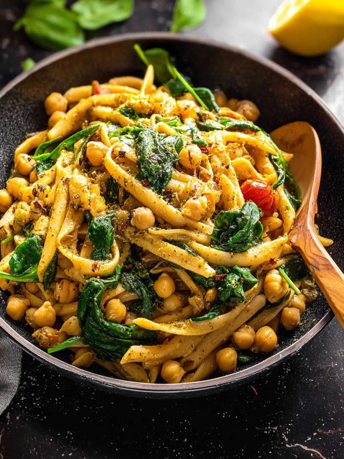 A flavorful chickpea pasta dish enriched with spinach, lemon, and za’atar spice.